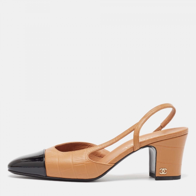 Chanel Brown/Black Leather and Croc Embossed CC Slingback Pumps Size 39.5