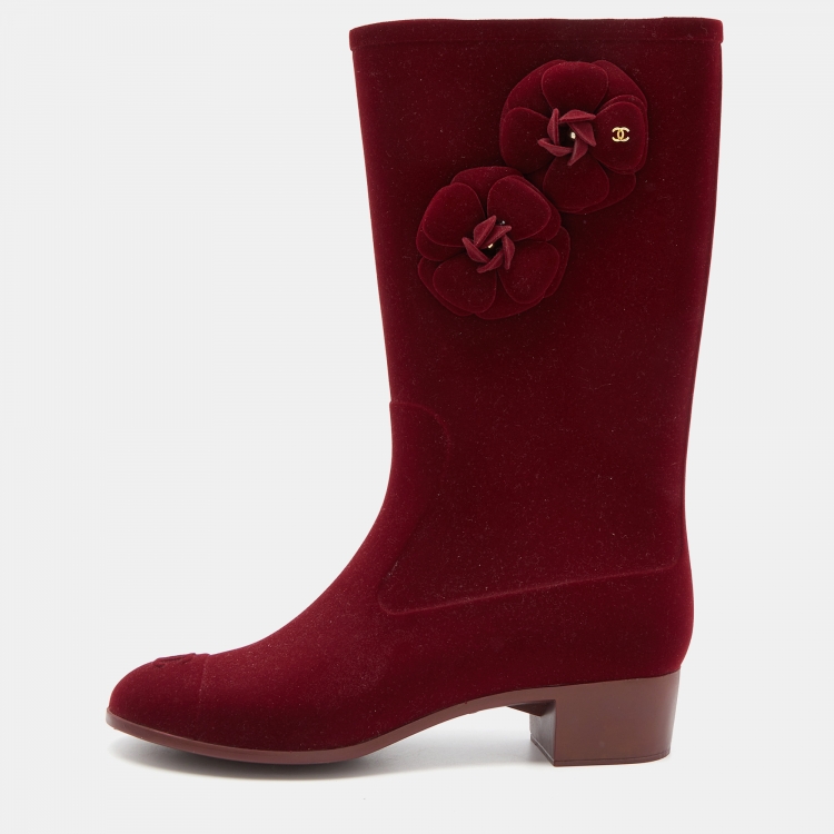 مملوكة مسبقًا حذاء بوت مطر شانيل CC مزخرف كاميليا قطيفة عنابي مقاس 40