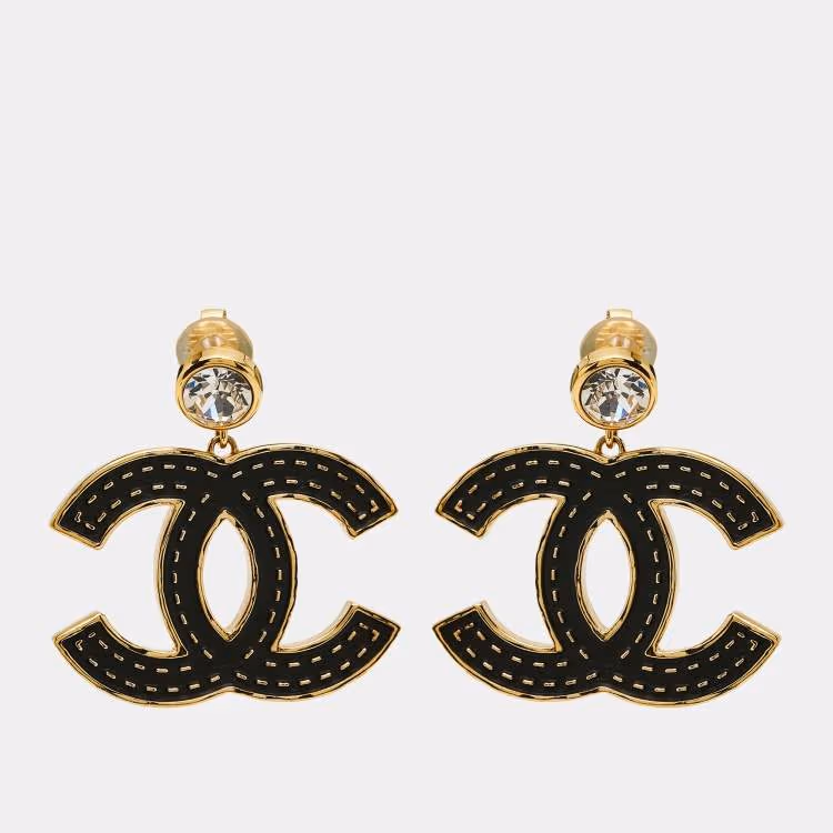 أقراط شانيل CC مطلية بالمينا مزينة بالكريستال وذهبية اللون