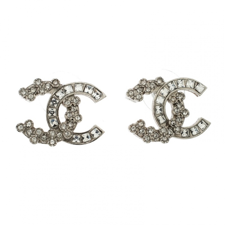 Pre Owned أقراط شانيل مرصعة لون فضي كريستال زهور CC