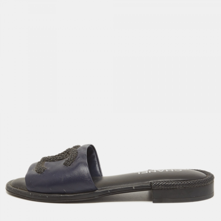 Chanel Navy Blue Leather Woven CC Flat Slides Size 38.5