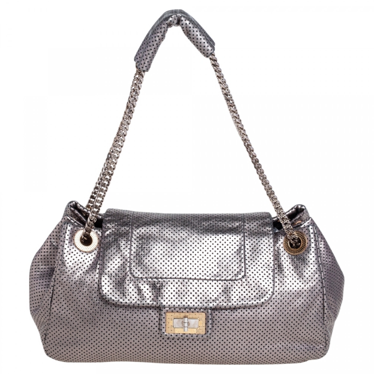 Pre Owned حقيبة شانيل أكورديون دريل جلد رصاصي ميتاليك مثقب كبيرة بقلاب كلاسيكي