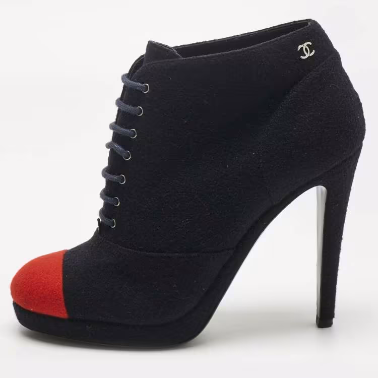 حذاء بوت كاحل شانيل سويدي فضي/أسود كعب لؤلؤ رباط علوي مقاس 38