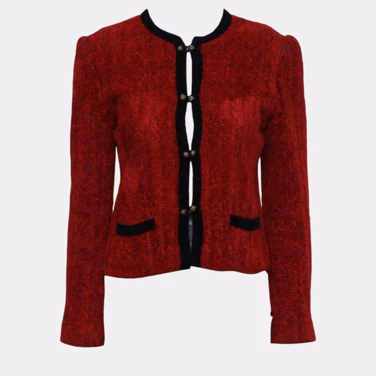 مملوكة مسبقًا جاكيت شانيل مخمل قديم أحمر/أسود مقاس متوسط