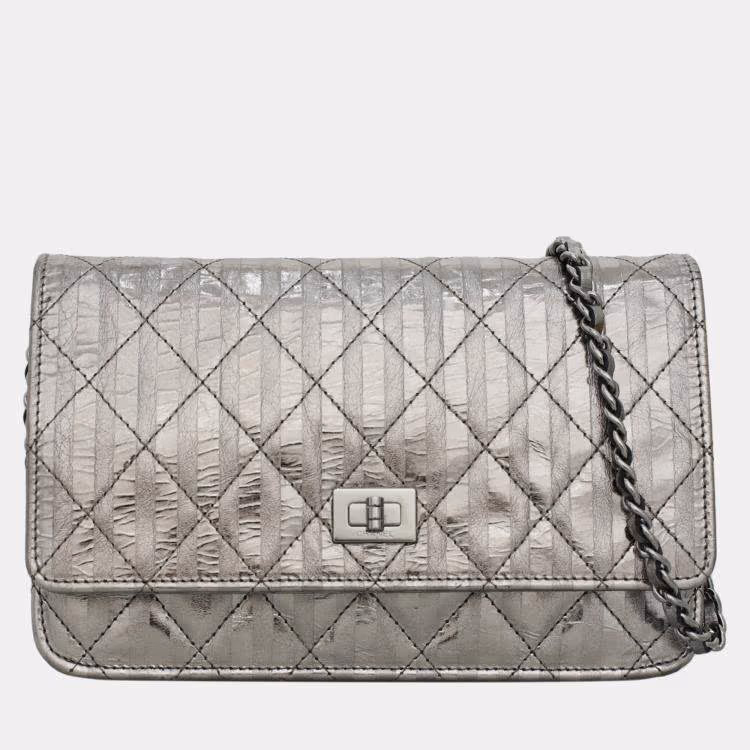 حقيبة شانيل فضية جلد العجل على سلسلة رباط