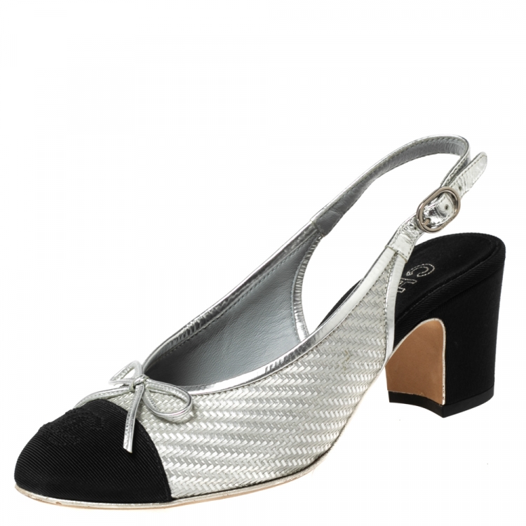 مملوكة مسبقًا صندل شانيل كعب عريض فتحة كعب فيونكة جلد وبي في سي مغزول أسود/ فضي مقاس 36