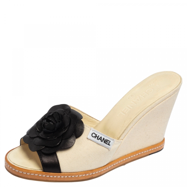مملوكة مسبقًا صندل سلايد شانيل كانفاس أبيض مزخرف زهرة كاميليا كعب روكي مقاس 39