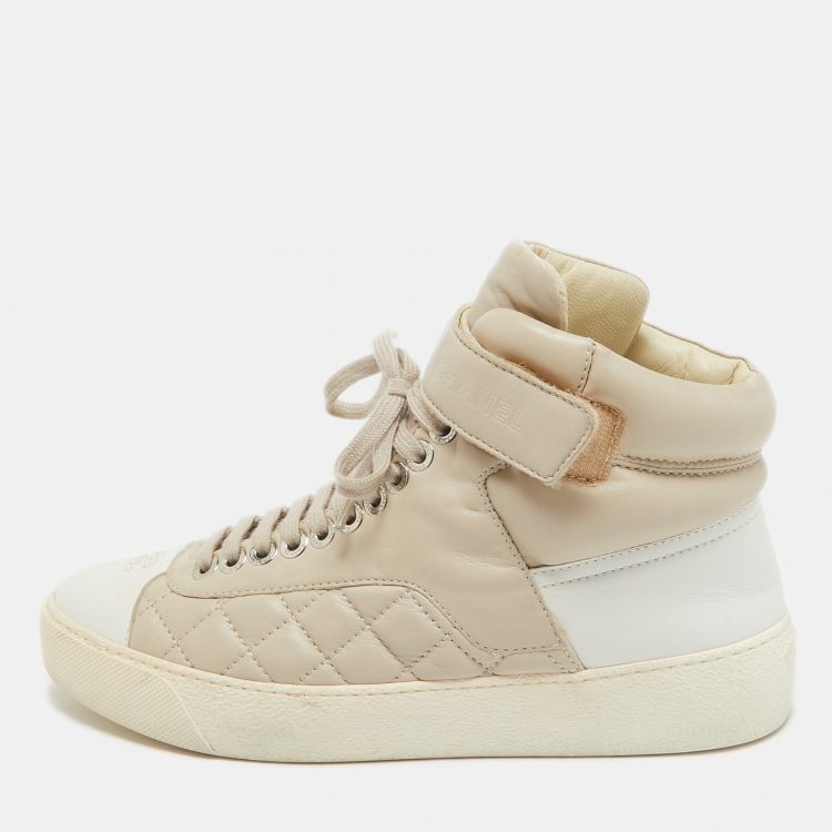 Chanel White/Pink Quilted Leather CC High Top Sneakers Size 35