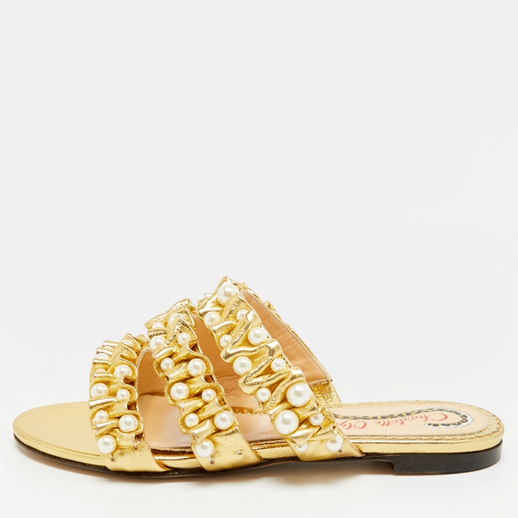 Pre Owned صندل مسطح جلد مطوي ذهبي مزين باللؤلؤ شارلوت أوليمبيا مقاس 35