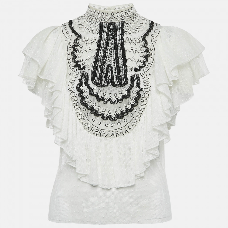 Pre Owned Christian Dior White Beaded Tulle Ruffle Detail Blouse S