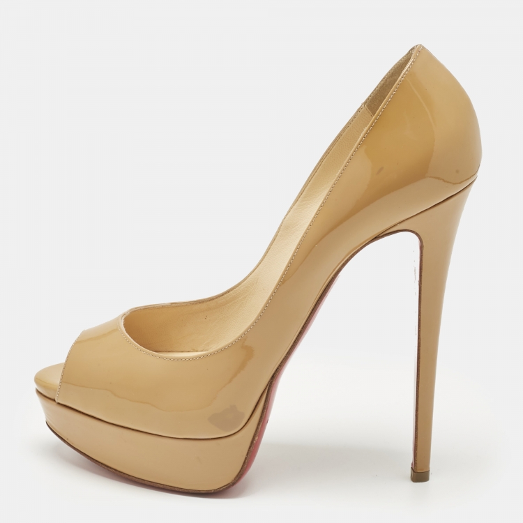 Pre Owned  حذاء كعب عالي كريستيان لوبوتان نيو فيري بريف بمقدمة مفتوحة بنعل سميك جلد لامع بيج فاتح مقاس 38.5