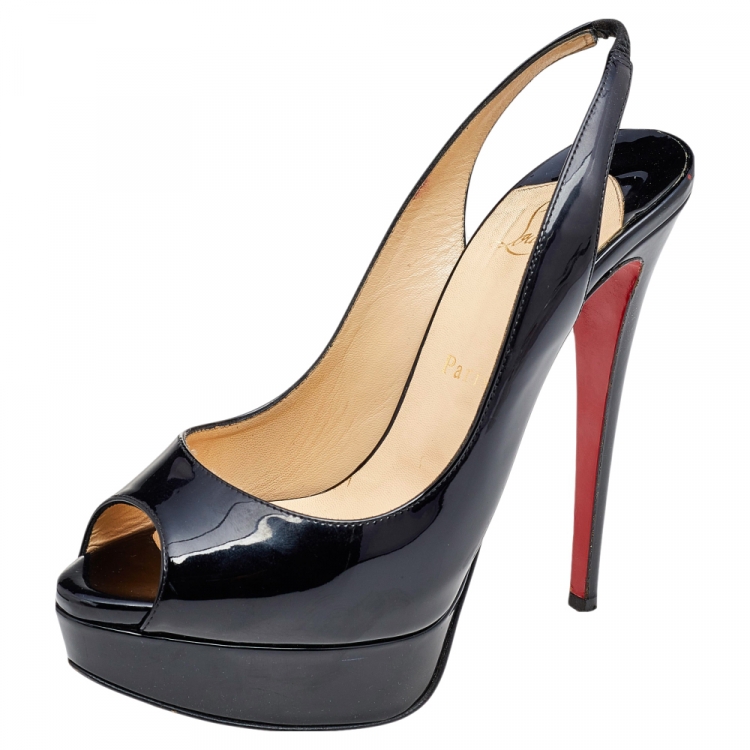 مملوكة مسبقًا صندل كريستيان لوبوتان ليدي جلد أسود لامع مقدمة مفتوحة نعل سميك مقاس 38.5