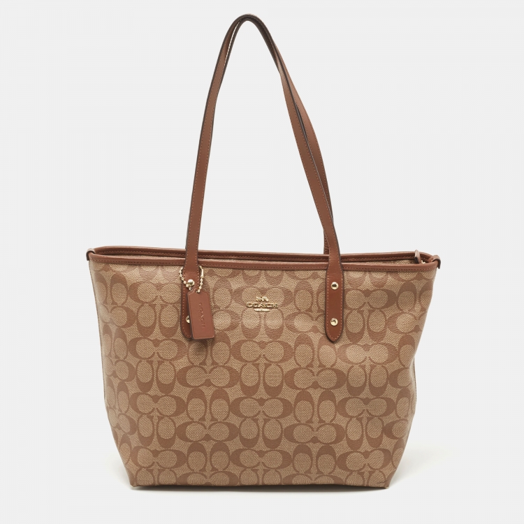 Coach Beige/Brown Signature Coated Canvas and Leather City Zip Tote