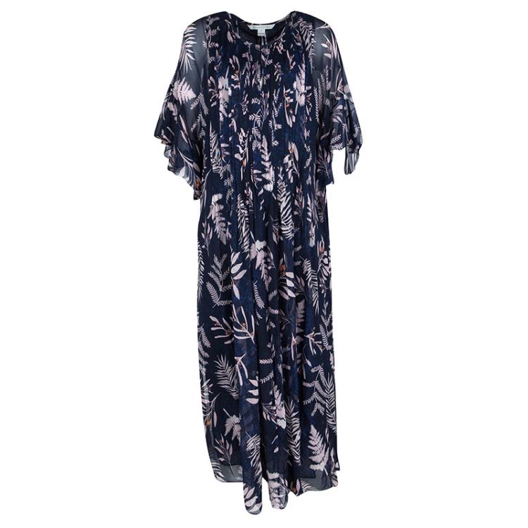 مملوكة مسبقًا فستان ماكسي ديان فون فرستنبيرغ هولودي حرير أزرق كحلي مورد مطبوع مقلم S