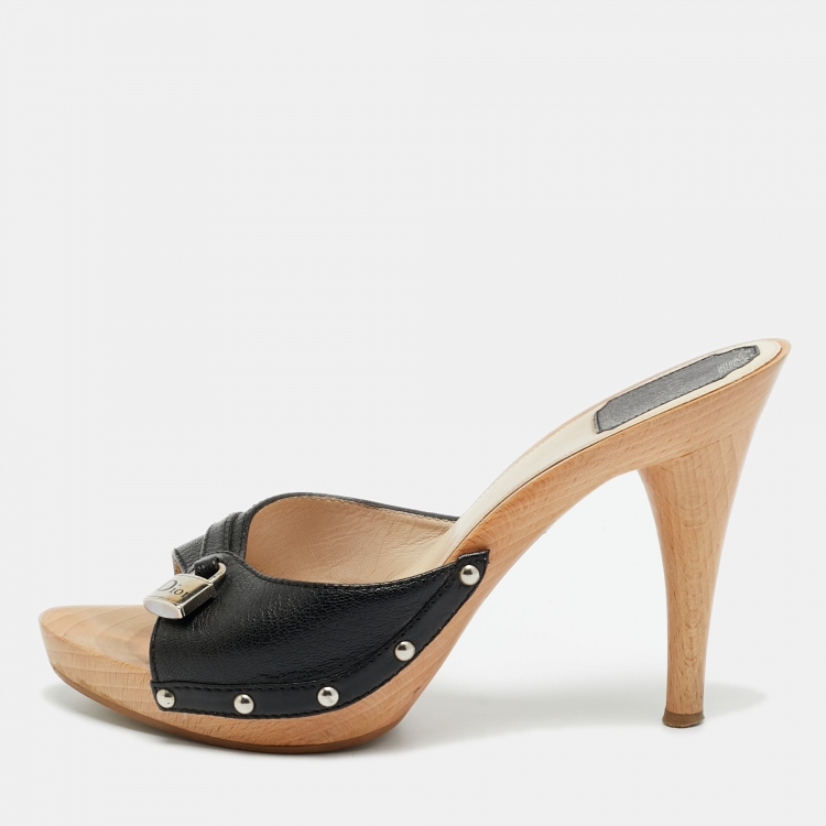 مملوكة مسبقًا حذاء مولز ديور خشبي مقدمة مفتوحة جلد أسود مقاس 37.5