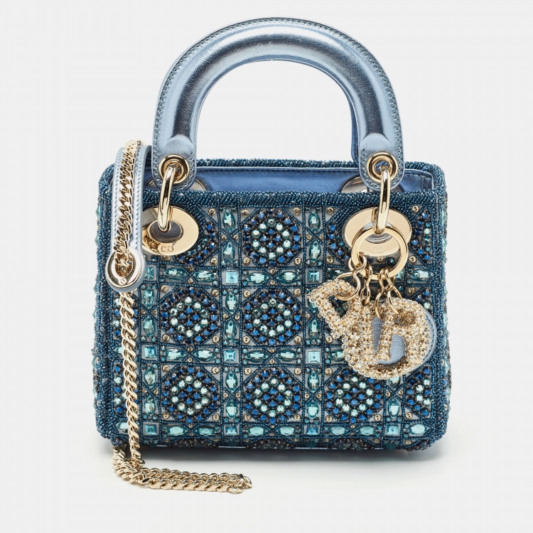 مملوكة مسبقًا حقيبة يد توتس ديور ميني ليدي ديور جلد أزرق ميتاليك وساتان مزخرف