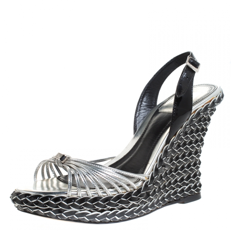 Pre Owned صندل ديور كعب روكي فتحة كعب نعل سميك جلد لامع و ضفيرة مجدولة ثنائي اللون مقاس 36