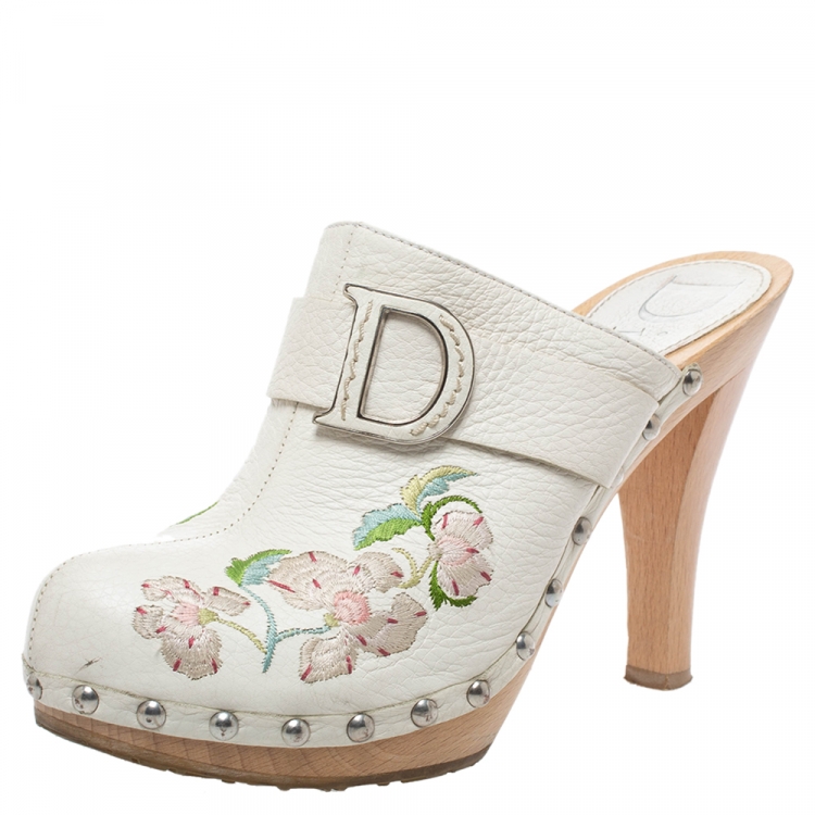 مملوكة مسبقًا حذاء كلوغ ديور نعل سميك جلد مطرز زهور أبيض مقاس 37