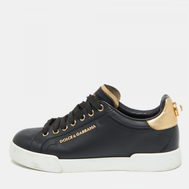Dolce & Gabbana Black Leather Portofino Pearl Embellished Low Top Sneakers Size 39.5
