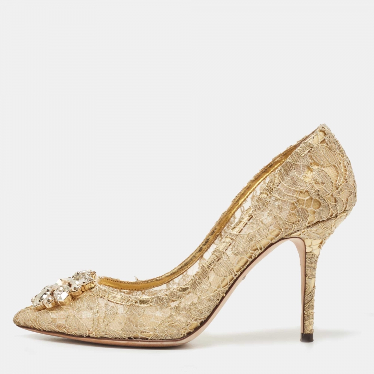 Pre Owned Dolce & Gabbana Gold Lace Bellucci Crystal Embellished Pumps Size 39