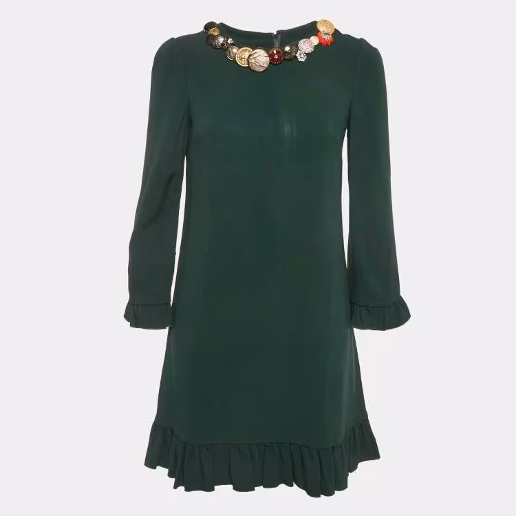 Pre Owned فستان دولتشي أند غابانا كريب أخضر بأزرار مرصعة بالكريستال كشكش مقاس صغير - سمول