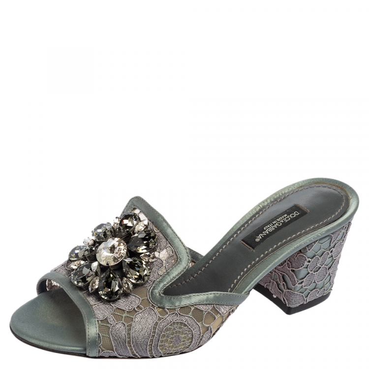 Pre Owned صندل سلايد دولتشي أند غابانا صوفيا منقوش دانتيل رصاصي مزخرف كريستال مقاس 35