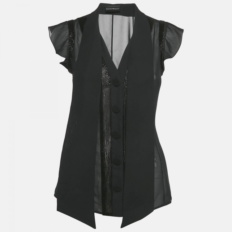 مملوكة مسبقًا قميص شيفون مطرز بالخرز أسود من إيمبريو أرماني شبه شفاف مقاس صغير (سمول)