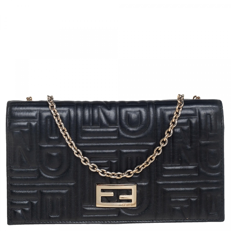 مملوكة مسبقًا محفظة بسلسلة فندي جلد أسود منقوش بالشعار