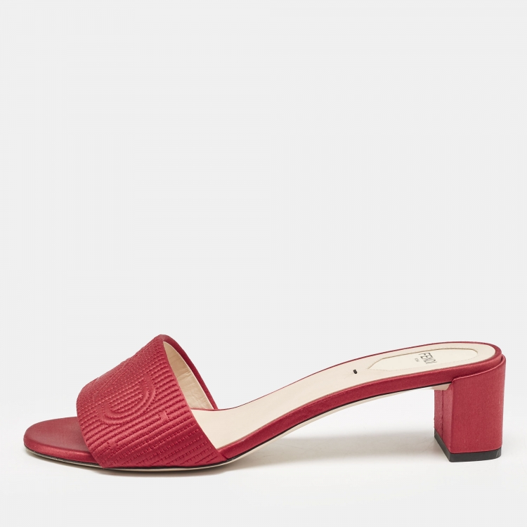 Pre Owned صندل فندي بشعار مطرز حرير أحمر كعب عريض مقاس 40