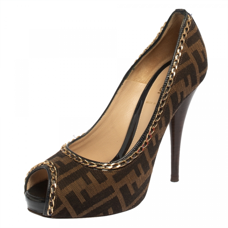 حذاء كعب عالي فندي كانفاس توباكو زوكا مزخرف مقدمة مفتوحة بسلسلة مقاس 37