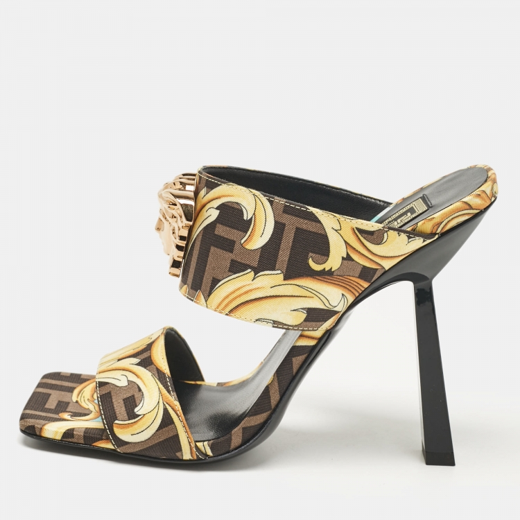 Fendi x Versace Black/Yellow Baroque Fabric Medusa Slide Sandals Size 36.5