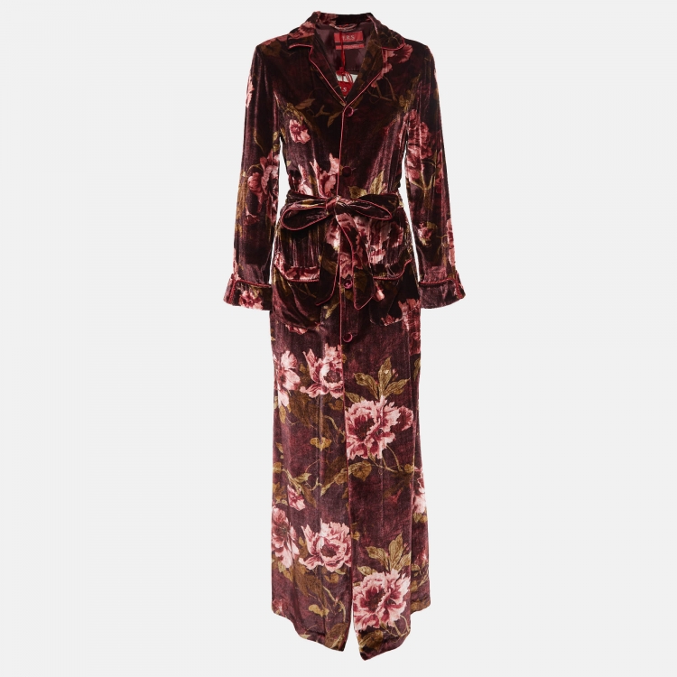 مملوكة مسبقًا F.R.S For Restless Sleepers Burgundy Floral Print Velvet Robe Dress M