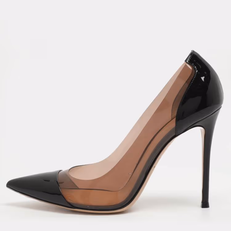 حذاء كعب عالي جيانفيتو روسي جلد لامع أسود و PVC بليكسي مقدمة مدببة مقاس 42