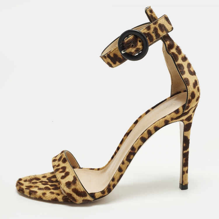 مملوكة مسبقًا صندل جيانفيتو روسي بورتوفينو شعر عجل بنقشة فهد بني/بيج بسوار للكاحل مقاس 36.5