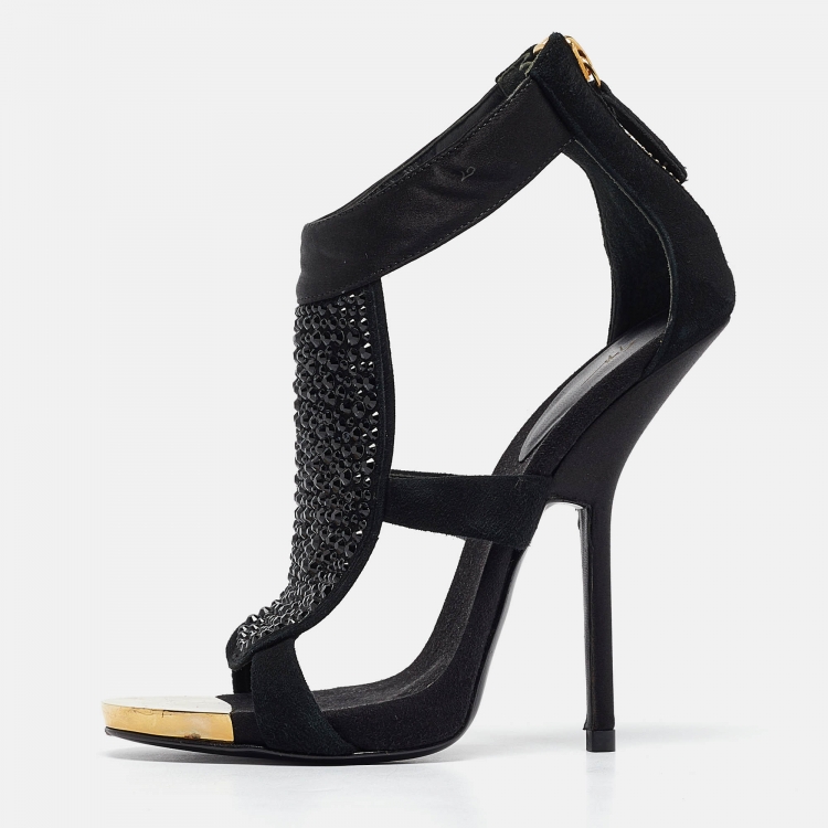 Giuseppe Zanotti Black Satin and Suede Crystal Embellished Ankle Strap Sandals Size 36.5