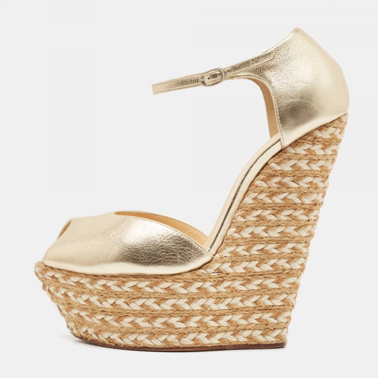 Giuseppe Zanotti Gold Leather Wedge Ankle Strap Espadrille Sandals Size 38