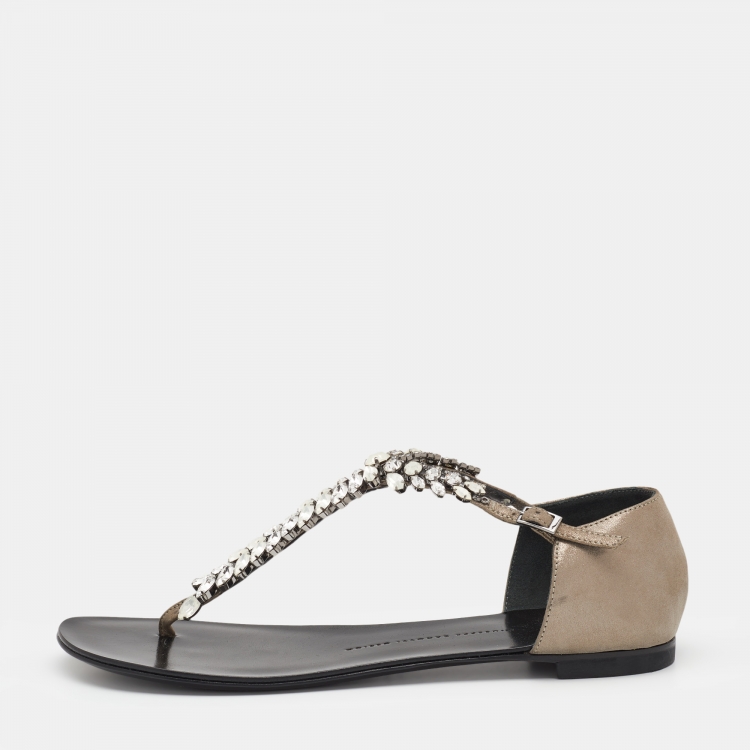 مملوكة مسبقًا صندل إصبع جوسيبي زانوتي جلد رصاصي ميتاليك مزخرف كريستال مقاس 40