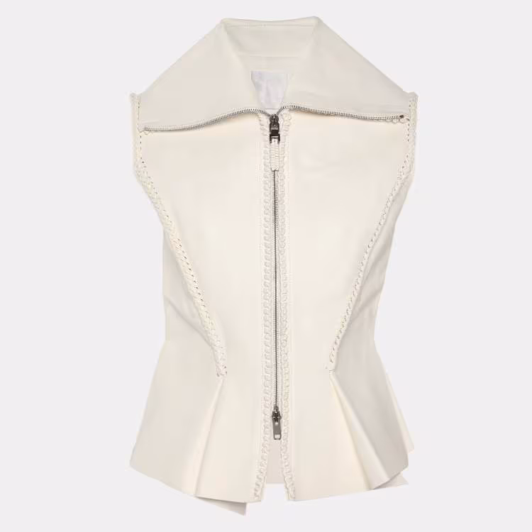 جاكيت جيفنشي بدون أكمام جلد أبيض مائل للرمادي بتفاصيل مضفرة مقاس صغير