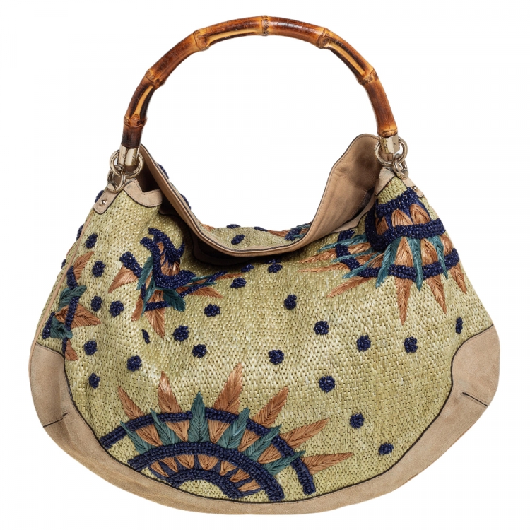 Pre Owned حقيبة هوبو غوتشي بيغي يد بامبو رافيا مطرز و سويدي بيج