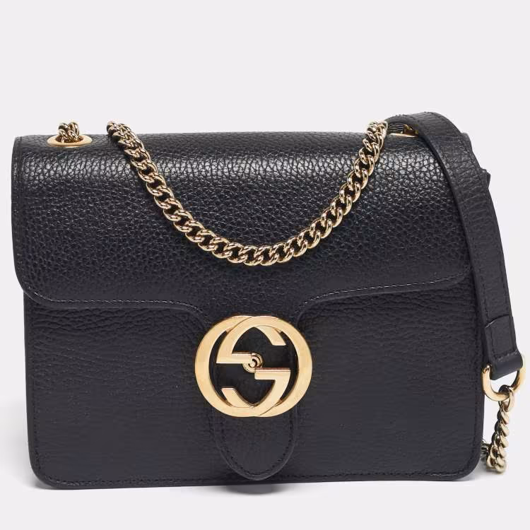 حقيبة كتف غوتشي إنترلوكنغ G جلد أسود دولار بشريط سلسلة
