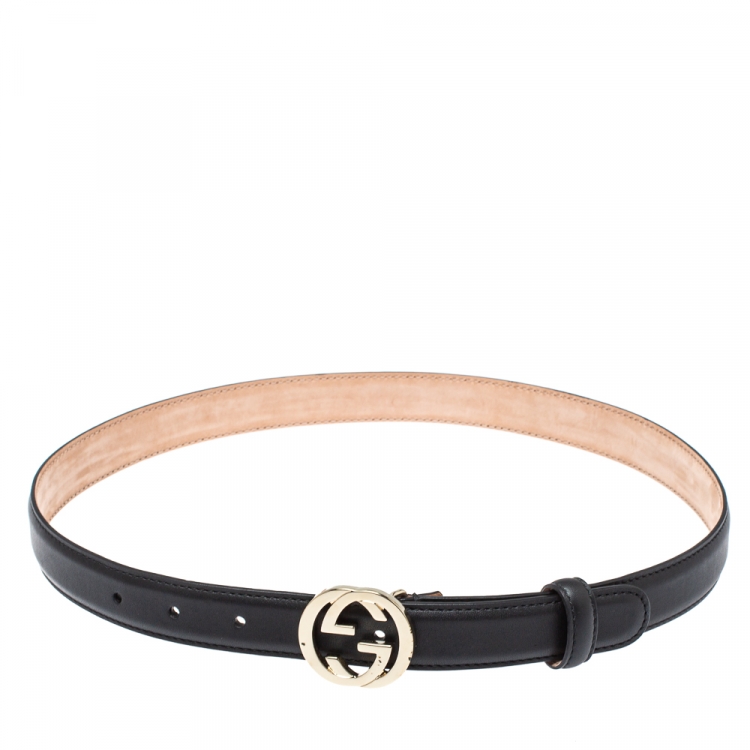 حزام غوتشي رفيع إبزيم جي جي متداخل جلد أسود 75 سم