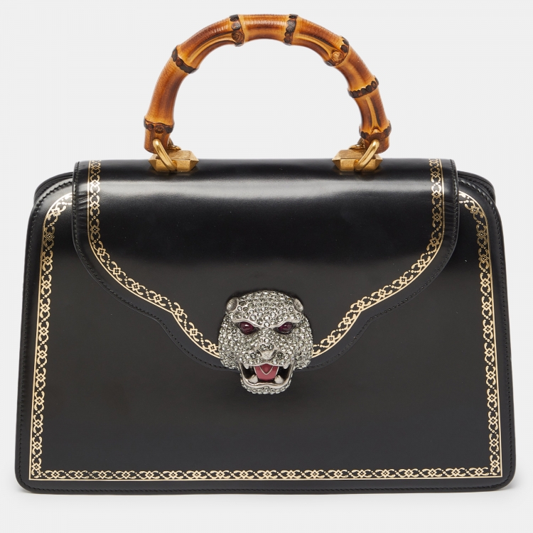Gucci Black Leather Medium Thiara Lisse Cornice Crystal Bamboo Top Handle Bag