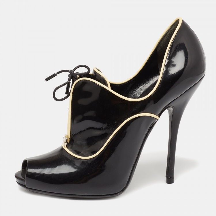 Pre Owned حذاء بوت كاحل غوتشي نيوتون جلد لامع أسود مقدمة مفتوحة 39.5