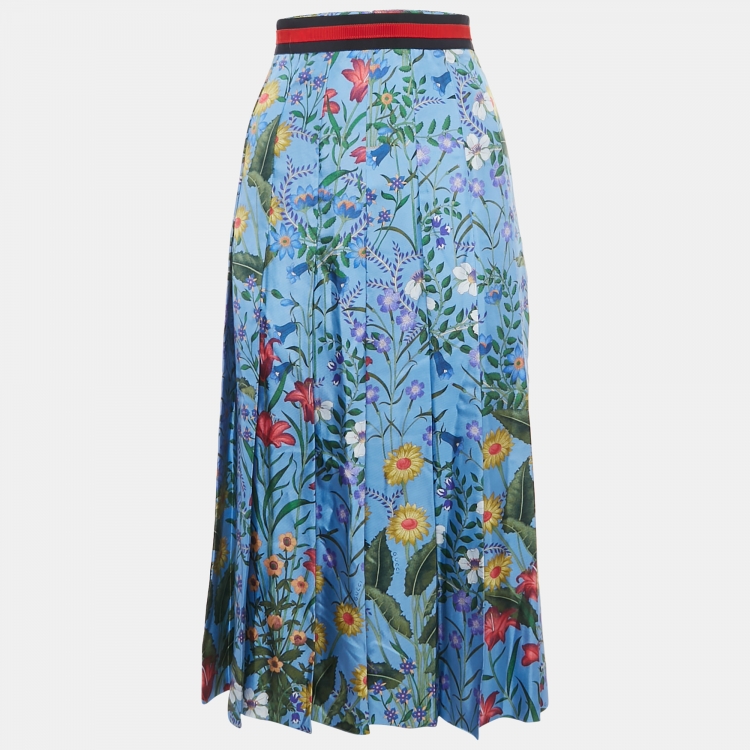 تنورة غوتشي حرير أزرق بنقشة زهرية مثنية مقاس صغير (سمول)