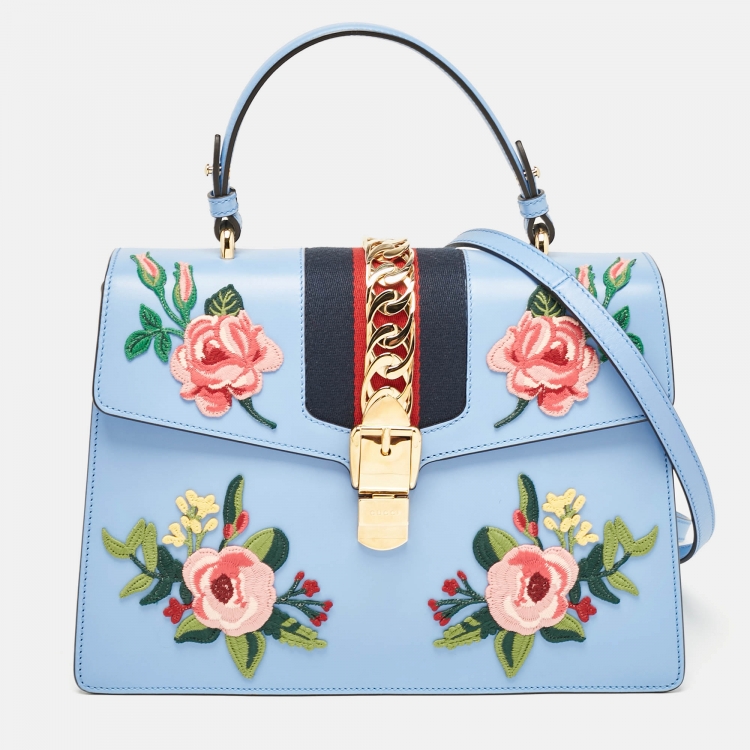 Gucci Blue Leather Floral Embroidered Medium Sylvie Top Handle Bag