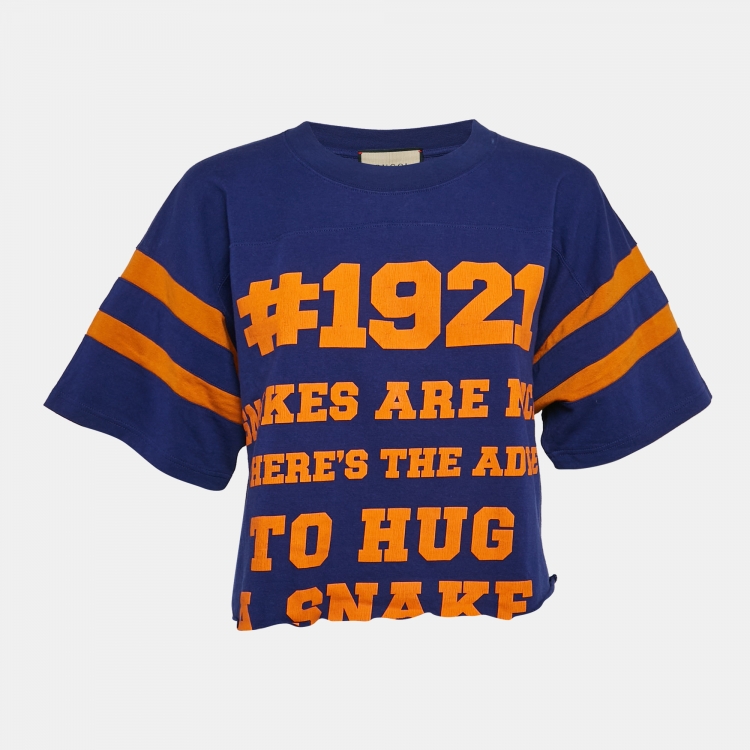 مملوكة مسبقًا Gucci Blue Printed Cotton Raw Edge Detail Cropped T-shirt XS
