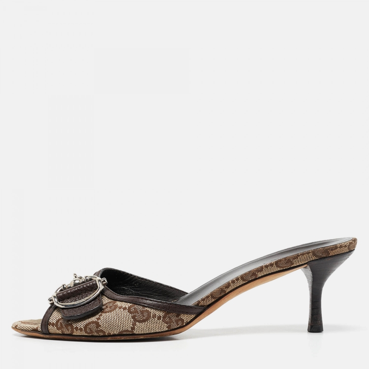 Gucci Brown/Beige GG Canvas Icon Bit Slide Sandals Size 37