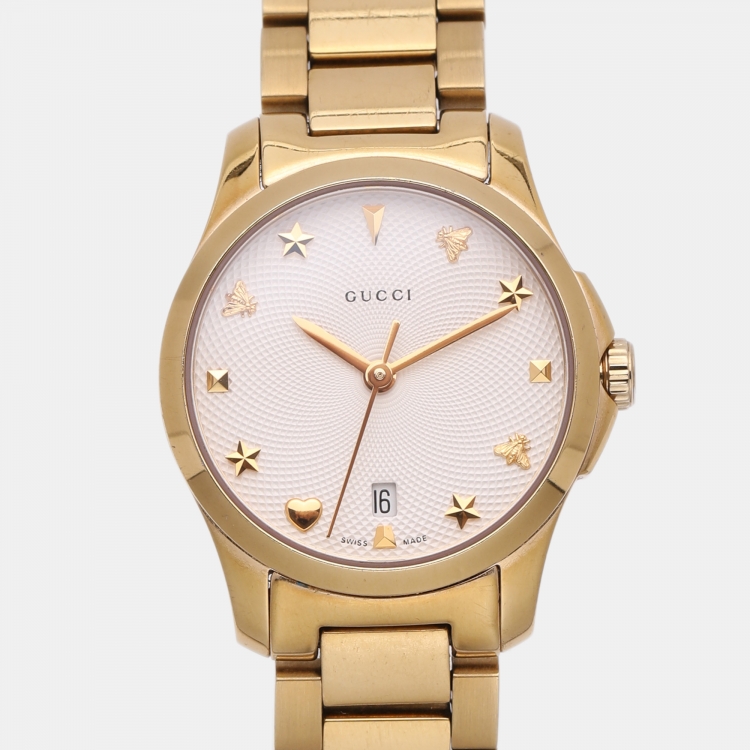 ساعة يد نسائية غوتشي جي-تايمليس 126.5 ستانلس ستيل مطلي بالذهب الكريمي 28 مم