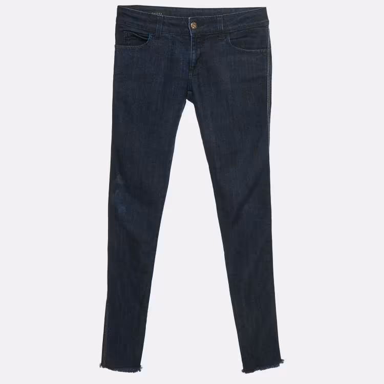 مملوكة مسبقًا بنطلون جينز غوتشي أزرق داكن بتفاصيل قوس قزح بحافة خام خصر 27 إنش مقاس صغير