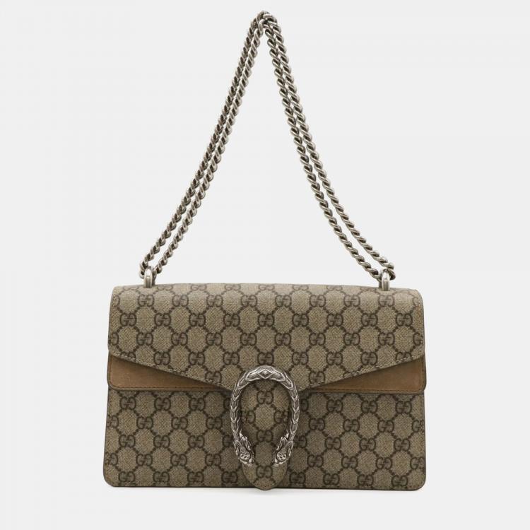 Pre Owned Gucci Dionysus Gg Supreme Shoulder Bag Chain Tiger Head Suede Beige